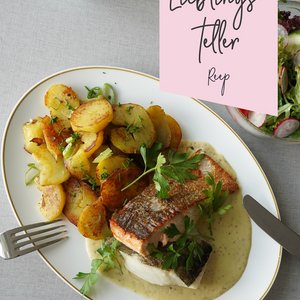 Fisch je nach Fang in grober Senfsauce mit Bratkartoffeln und buntem Salat28